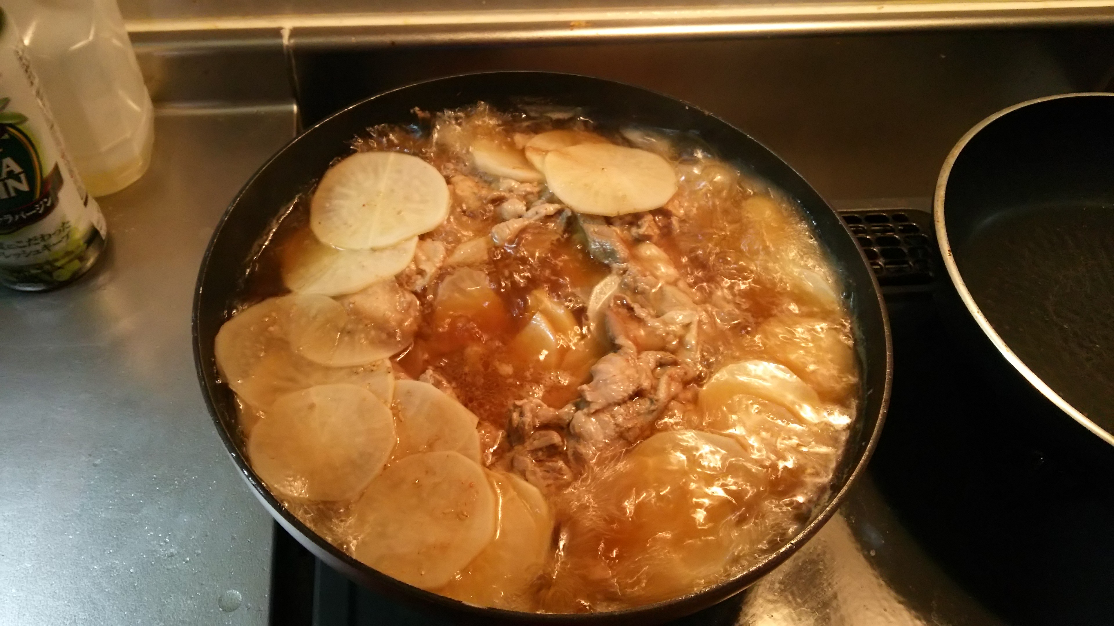 レシピの動画だと大根と肉を左右交互に詰めていましたが、上下に交互でもやってること変わんないであろうと考え、大根を敷き詰めてその上に豚肉を敷き詰めました@w@