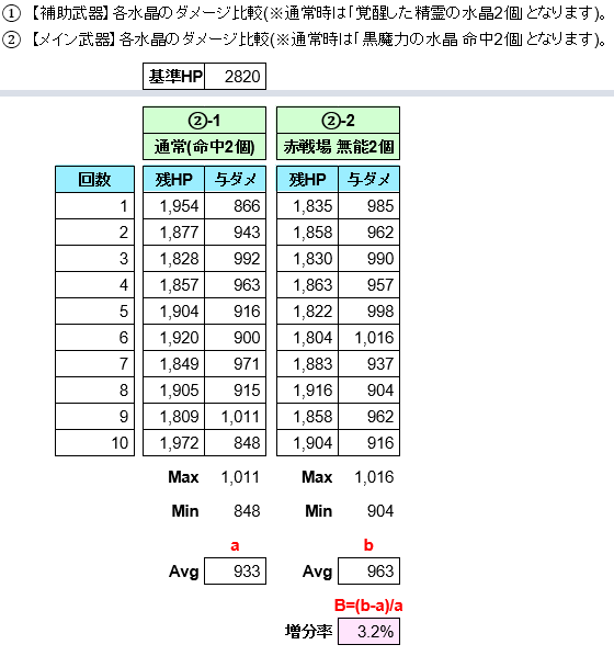 【水晶によるダメージ比較(補助武器編)】