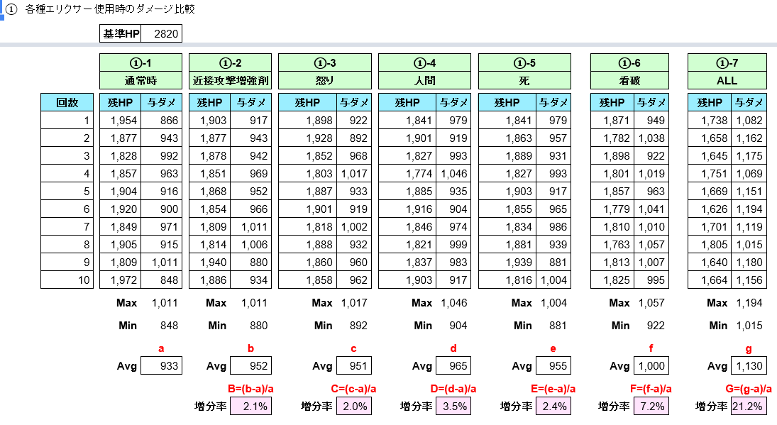③エリクサーを飲んでいない状態と、各種エリクサーを飲んだときの与ダメージから比較を行う。