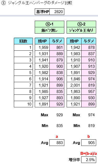 ③飯バフがない状態と、ジャングルの王ハンバーグを食べたときの与ダメージから比較を行う。